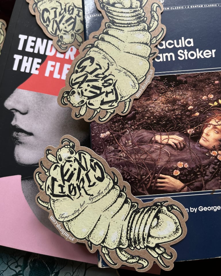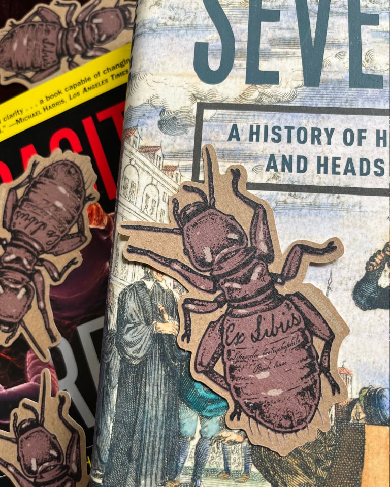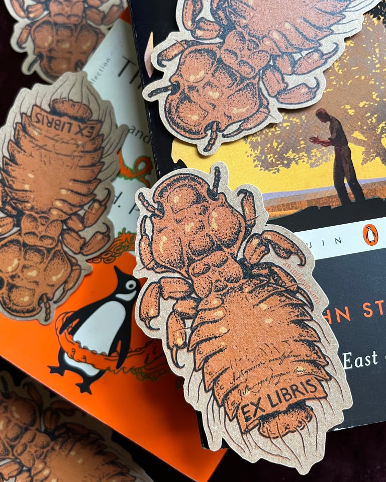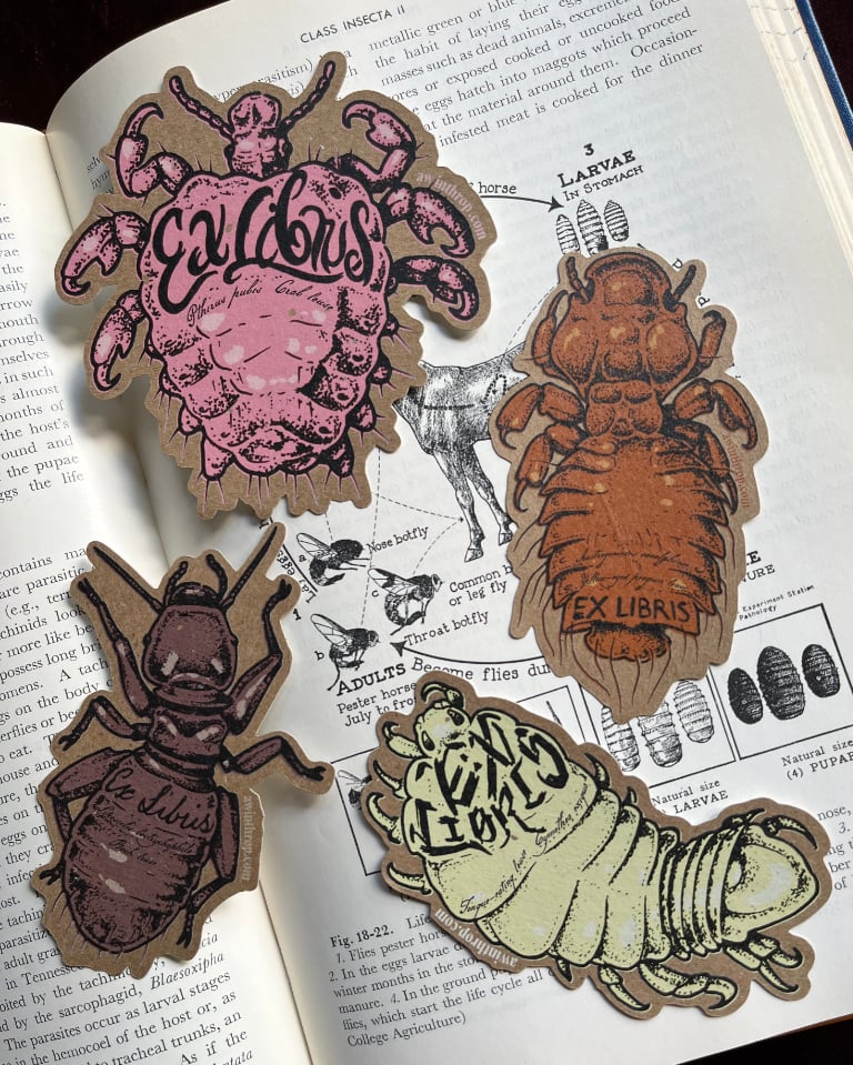 Are you a bookworm with a need for keeping your books from walking off? Perhaps you need a grippy friend or two to let everyone know beyond a shadow of a doubt that this library belongs to you. These handy bookplates feature a friendly assortment of lice (and louse-adjacent invertebrates), all ready to grab onto your books and proudly display your name to anyone who dares to crack open their covers. The set includes: