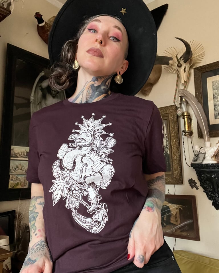 These soft short sleeved tees feature designs on both the front and sleeve, and are printed by the artist in bone white ink on oxblood Bella + Canvas unisex tees. Perfectly stylish for getting up to good frivolity.