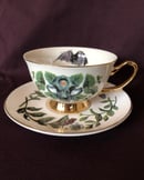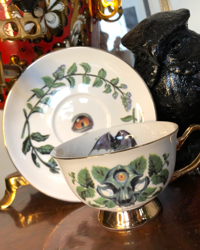 Just the right kind of fancy cuppa for the sophisticated cat connoisseur. This fine teacup and saucer set features cat-themed designs from my own colored pencil work, ranging from an esoteric cat skull and a minute cat bat to boughs of coffee plant, camellia sinensis, and catnip. Gilded and glamorous, it's the perfect vessel for your morning tea, coffee, or warm beverage of choice.