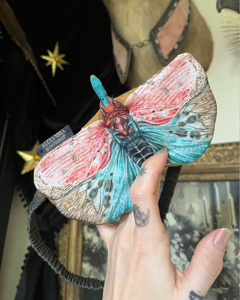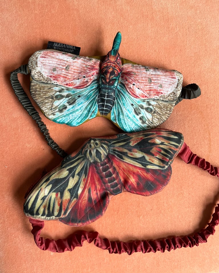 This is a handmade eye mask made from a 51%/49% cotton/silk blend sateen, sewn and hand-finished by the artist with subtle 3D molding to give it a more bug-like shape. Made for creatures of the night who need a little darkness and a lot of glam during a midday nap. Fitted with an elastic band to fit a range of head circumferences, and wonderfully breathable against the skin. The lanternflies are a little fuller than the moth eye masks, so if you prefer more face coverage from your eye mask, this one's the one to go for.
